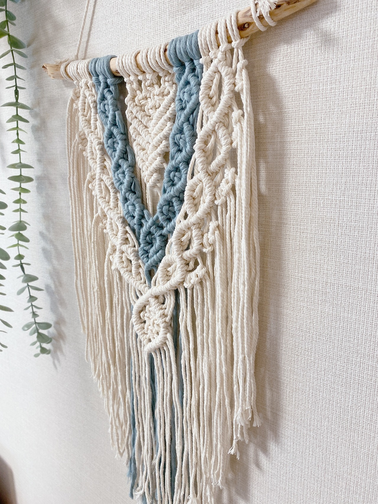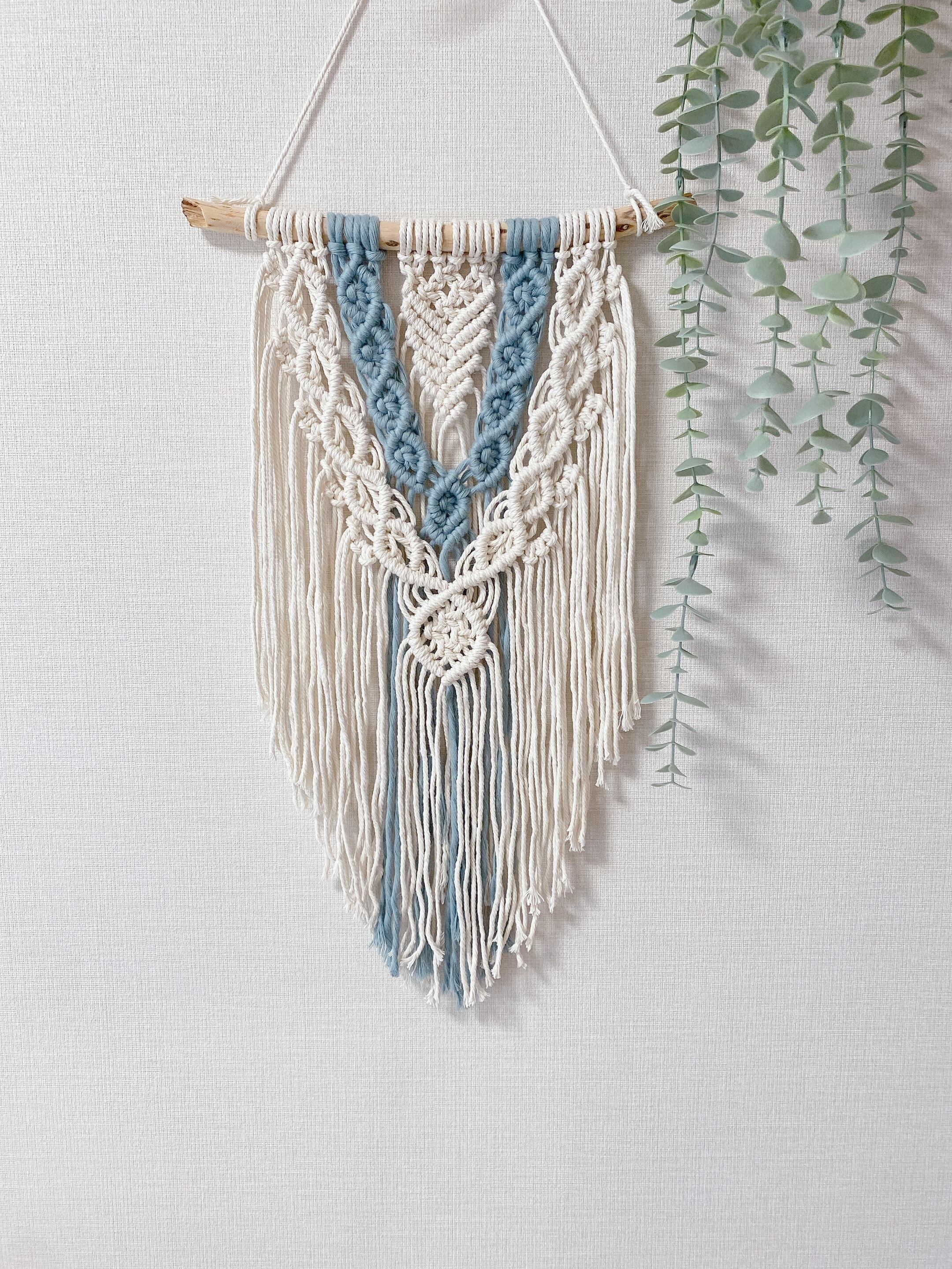 オールドブルーカラーを差し色に、涼しげで落ち着いた印象のあるマクラメタペストリーです。